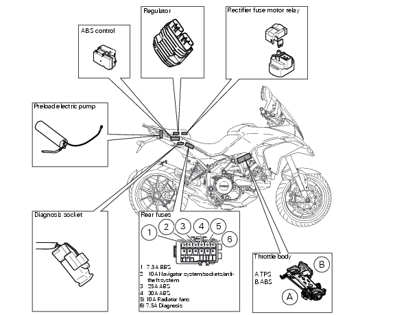 Like the Dash Board unit, the BBS is connected to sensors and actuators installed on the vehicle. The unit makes the information received from the sensors available over the network and controls the actuators, also in response to orders received from other computers connected to the network. It also has another fundamental function, as it gathers all the errors registered by the other computers due to specific faults. The software in the BBS also performs the DTC function, which regulates engine torque delivery to prevent wheelspin under acceleration. When replacing the BBS, if the motorcycle is equipped with electronic suspension or heated handgrips, the BBS must be correctly initialised with the DDS.