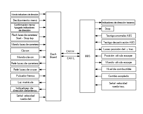 El Dash Board no tiene únicamente la función de visualizar las especìficas informaciones útiles para el piloto, está conectado con sensores y actuadores de la motocicleta. Pone en red las informaciones suministradas por los primeros y manda los segundos, también según los pedidos recibidos por los calculadores conectados a la red. En el display servicios, también se indican los funcionamientos incorrectos del sistema electrónico del vehìculo.