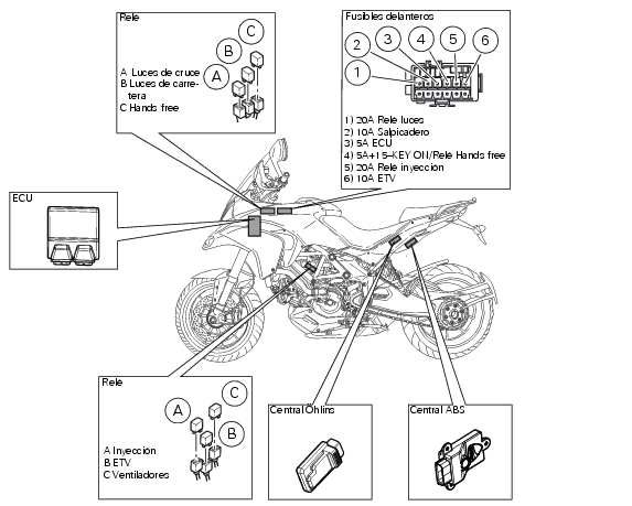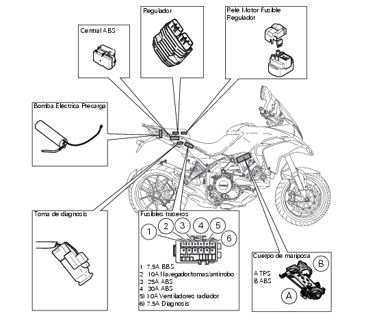 La BBS, como el Dash Board, está conectada con sensores y actuadores del vehìculo. Pone en red las informaciones suministradas por los primeros y manda los segundos, también según los pedidos recibidos por los calculadores conectados a la red. También desarrolla otra función fundamental, recibe todos los errores registrados por los calculadores, errores por especìficos funcionamientos incorrectos. El software presente en la BBS desarrolla también la función DTC, que controla la erogación del motor para evitar el deslizamiento de la rueda motriz durante las aceleraciones. En caso de sustitución de la BBS, si en la moto están presentes las suspensiones electrónicas y los puños calefactados, se debe inicializar oportunamente la BBS con el DDS.