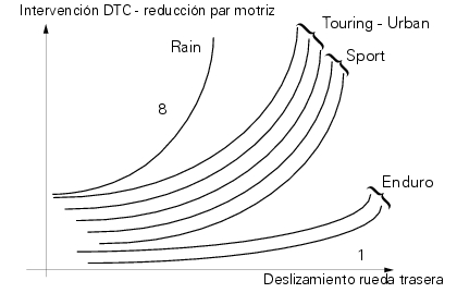 1 - 2 permiten un elevado deslizamiento de la rueda trasera (el DTC tiene un intervención limitada en el par motriz) y son utilizados para el uso de la moto en carreteras sin dificultades. Conducción Enduro