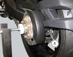 Quitar el guardabarros con protector cadena del basculante, destornillando los tornillos (4) y (8).